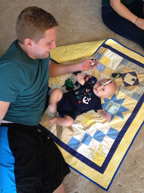 This little cutie has grown leaps and bounds in the last month. He was such a good boy to stay immobile for me through our trip, and now that we're home, he's started sitting up, rolling around on the floor, and eating real foods! He's like...a real little person!He also sucks his thumbs. People are always surprised to see him suck his thumb, but he's been doing it since he was about a month old! He is mostly anti-binky because he has a perma-binky on the end of his arm. He sucks it whenever he's tired or the minute he feels threatened by certain brothers who at times get a little too intrusive.
